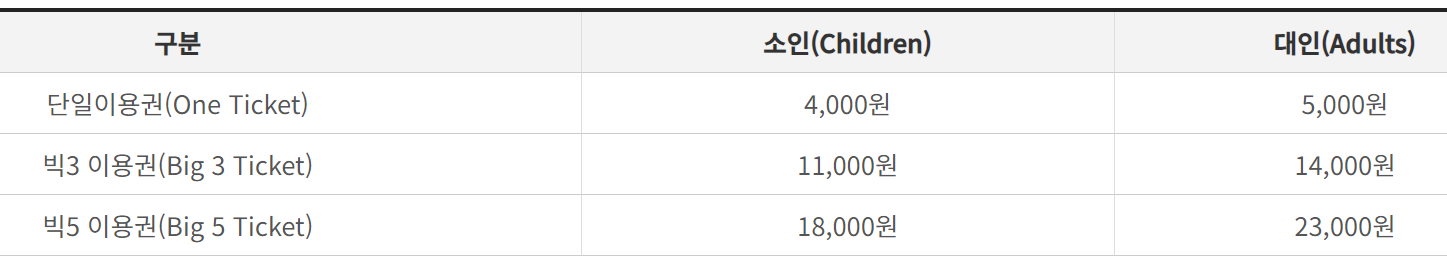 - 이용요금 : 일반 15,000원 / 초등학생 13,000원