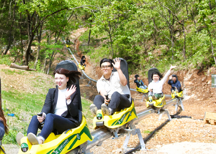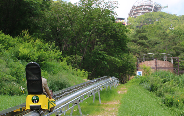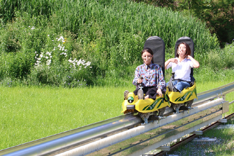 숲속에 설치된 960m의 모노레일로 최대 40km의 속도로 질주하는 레포츠 시설입니다.
